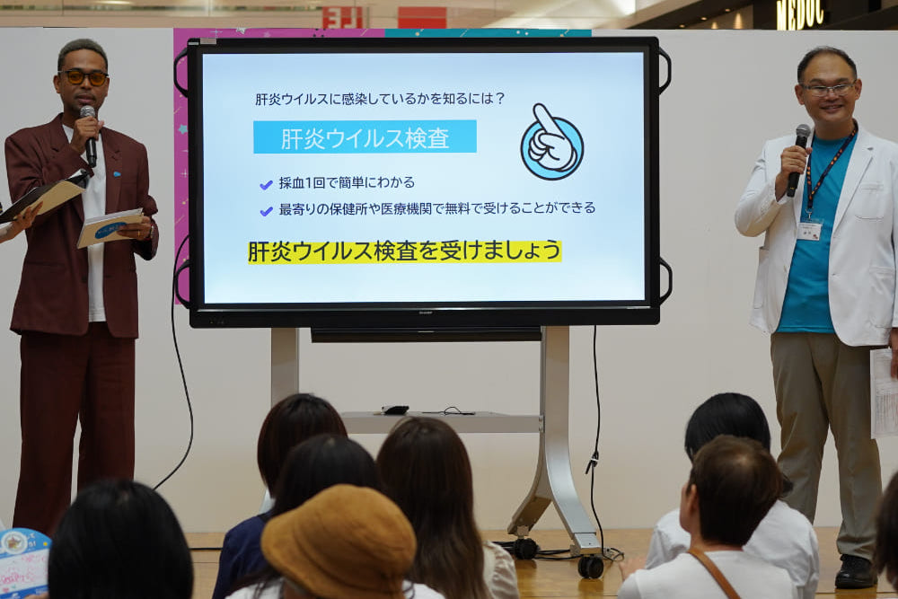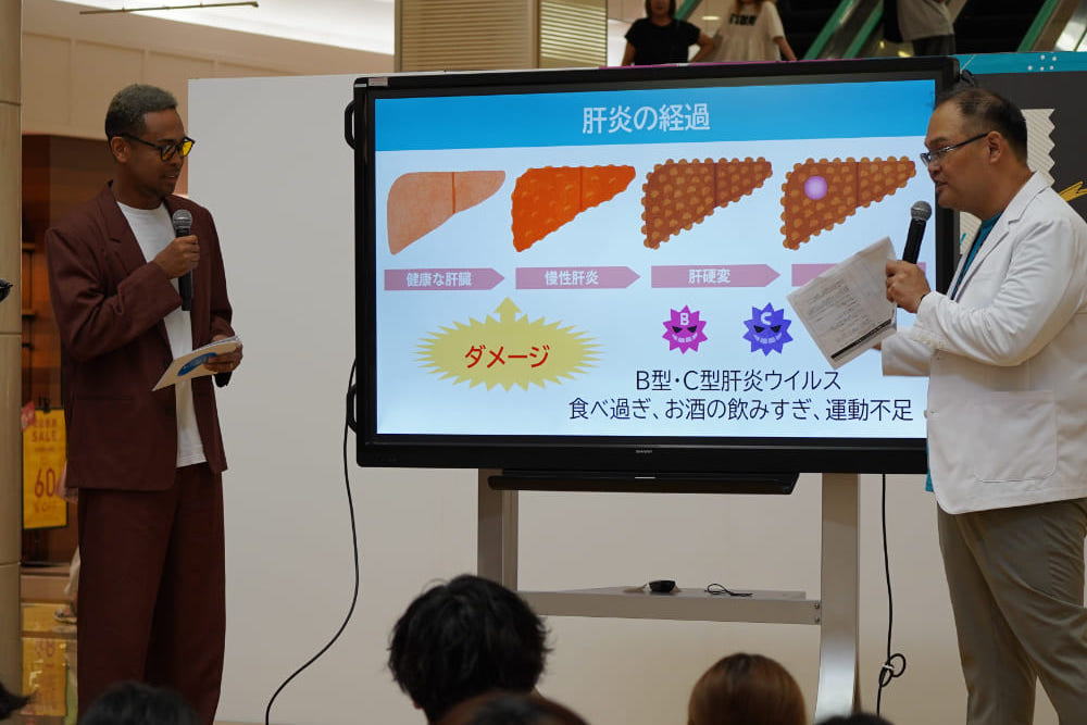 ■ 磯田氏「近年は生活習慣による肝炎が増え、とても問題になっています。」 磯田氏は肝炎がどのような病気であるかをわかりやすく説明した上で、「近年では、ウイルス性だけではなく過度な飲酒や食べ過ぎなど、生活習慣が原因の肝炎が大きな問題となっています。」と述べました。肝炎ウイルスに感染していると知らずに過ごしている人も多いという話を受けたEXILE NESMITH氏は、「肝臓は“沈黙の臓器”と言われており、自覚症状がないまま病気が進行することがあります。放置すると肝がんなど命にかかわる病気につながることもあるので注意が必要です。」と肝炎ウイルス検査の重要性を伝えました。会場では無料の肝炎ウイルス検査が実施されており、 「ぜひ、この機会に検査を受けてください、まずは“知ること”がとても大切です!」と呼びかけました。