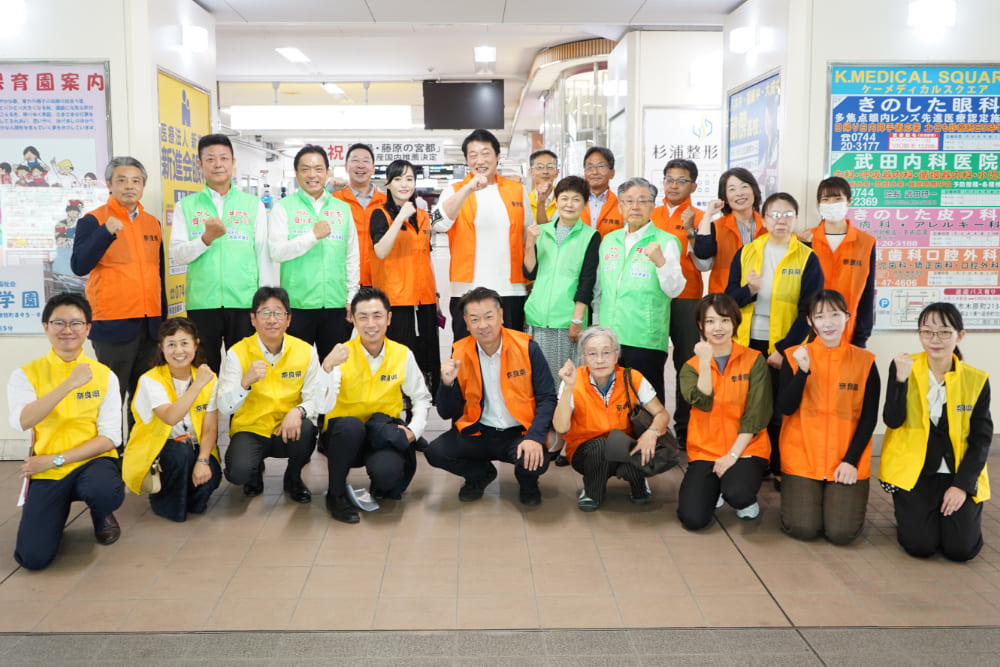 トークショーに先立ち、近鉄大和八木駅の改札前にて、小橋氏らがチラシを配布しながら、県民の皆様に対して街頭啓発を行いました。